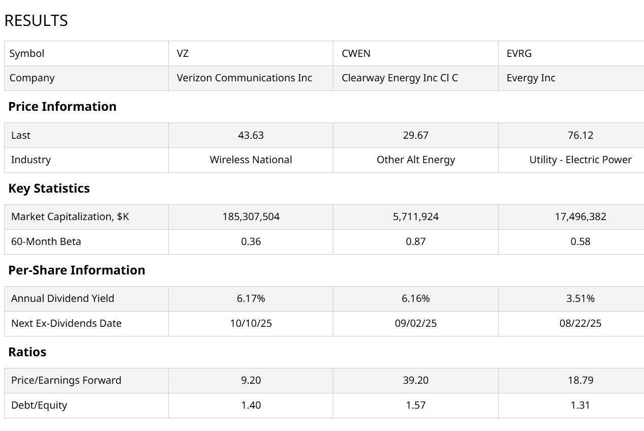 Using the stock comparison tab, I selected these three stocks, with the charts to follow below. Verizon (VZ) is by far the biggest and most recognizable of the trio. The DIV ETF casts a wide net, and its average stock is smaller than an S&P 500-type screener. Clearway Energy Class C (CWEN) is focused on alternative energy, and stocks in that market area are getting a bid lately.