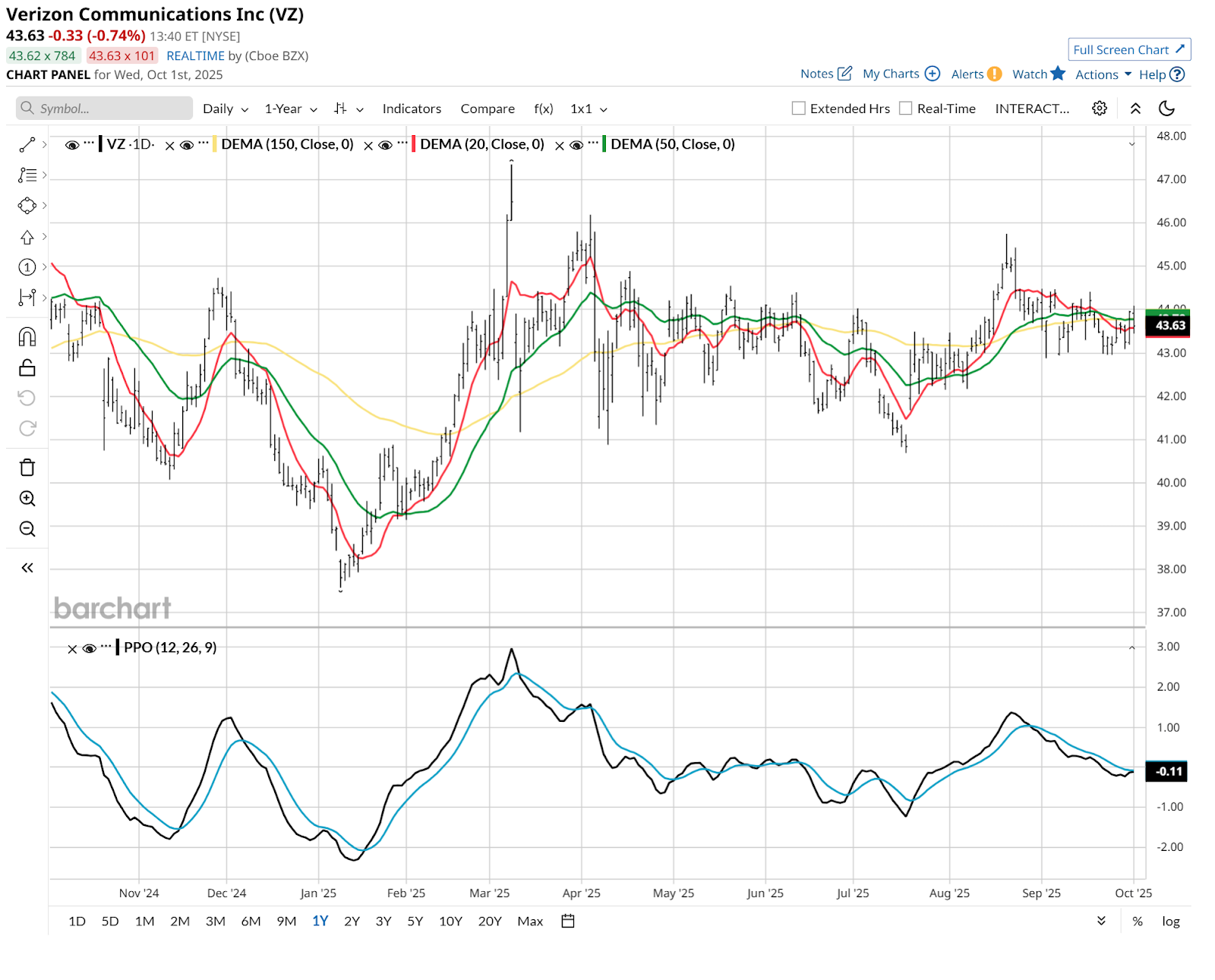 VZ’s chart looks as it often does: like its return above its 6.3% yield will be modest. But if a dividend investor can get that type of yield plus a bit of capital appreciation, that’s not bad in this frenzied market.