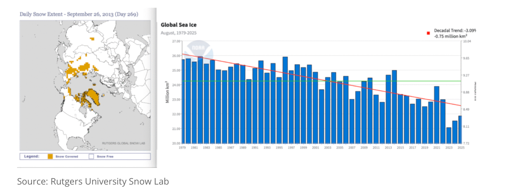 - El Niño-Southern Oscillation (ENSO): Although Northern Hemisphere winter snow cover is largely independent of ENSO, this large-scale ocean-atmosphere phenomenon in the Pacific can influence regional winter weather patterns. Right now, we have a neutral El Niño or weak La Niña developing.