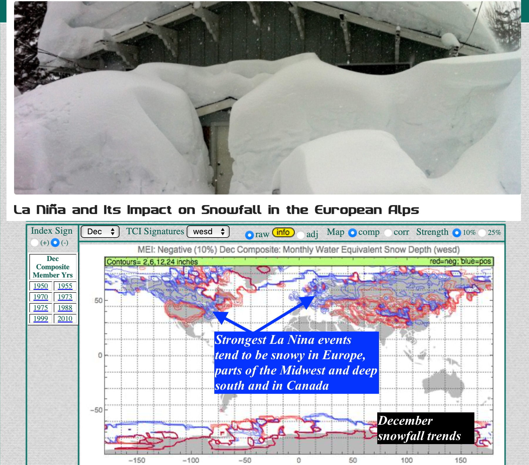 The strongest of La Niña events can sink the jet stream further south and create an occasional negative AO index over the Arctic. This can bring great snow and ski conditions to the European Alps.