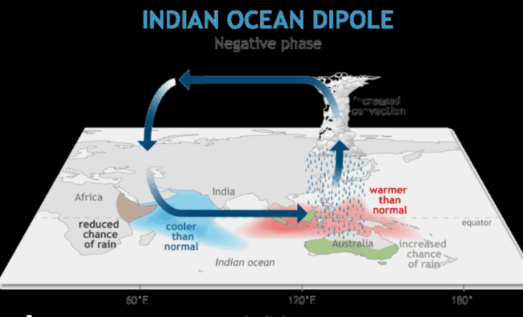 La Niña, negative Indian Ocean Dipole (IOD), and negative Pacific Decadal Oscillation index (PDO)