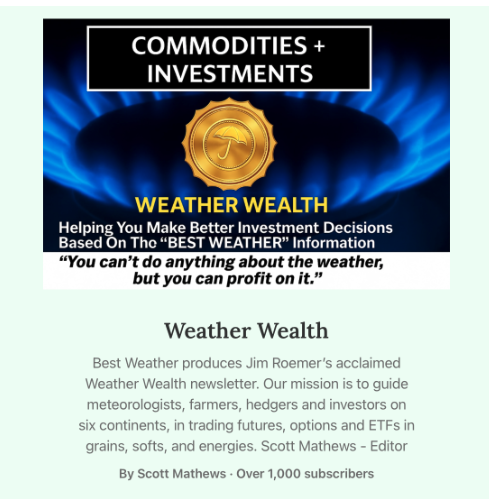 by Jim Roemer - Meteorologist - Commodity Trading Advisor - Principal, Best Weather Inc. & Climate Predict - Publisher, Weather Wealth Newsletter