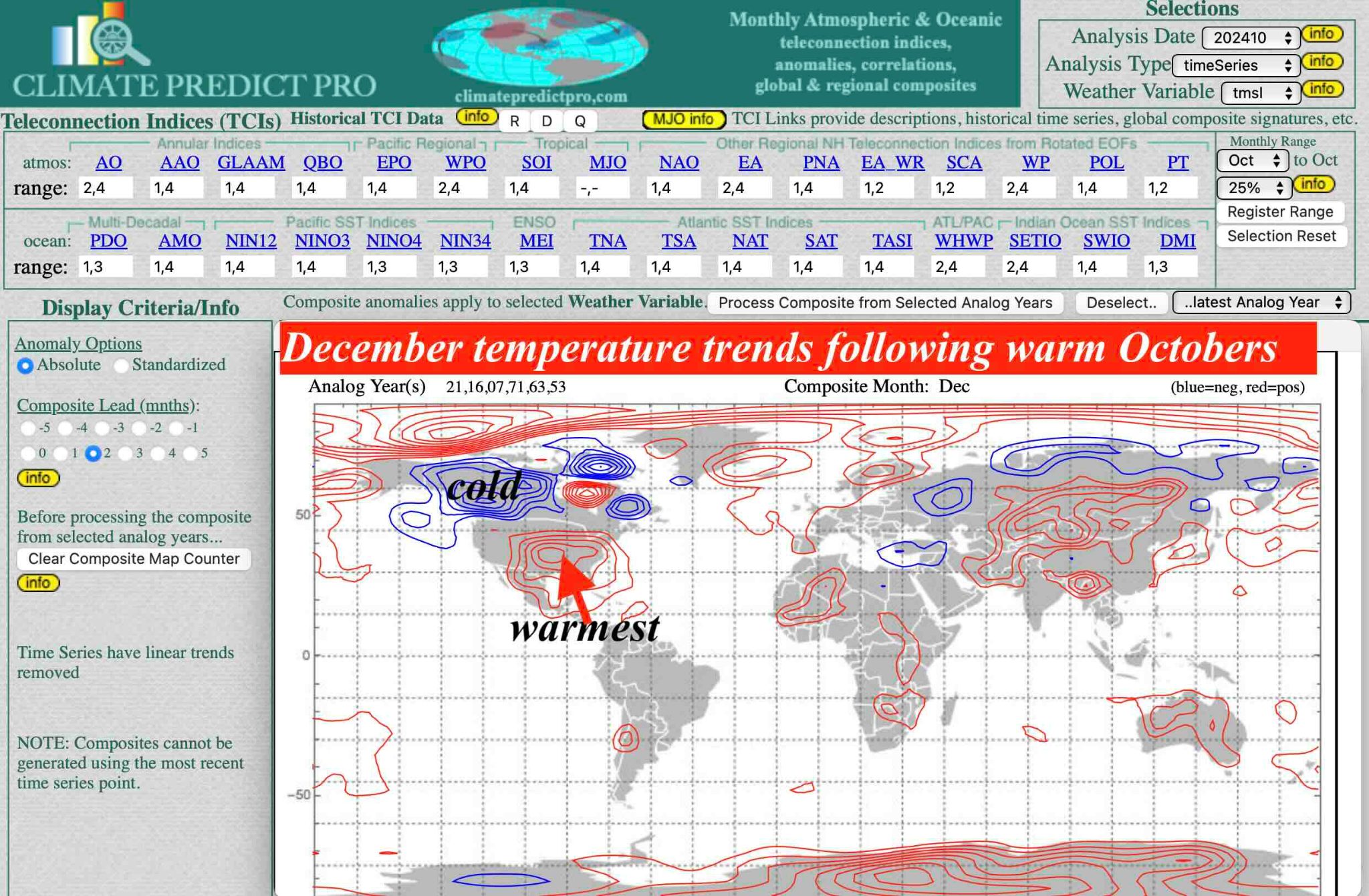Winters in the U.S. are rarely colder than normal following a warm October. You can see this from my ClimatePredict program: