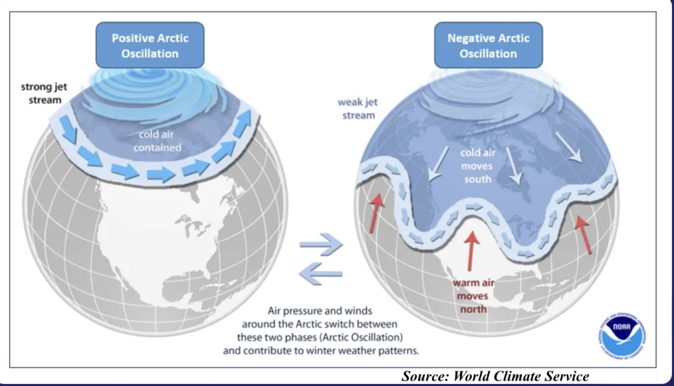 Factors like Arctic sea ice and the extent of Asian and Canadian snow cover by late October and November will affect the Arctic Oscillation index and winter weather.